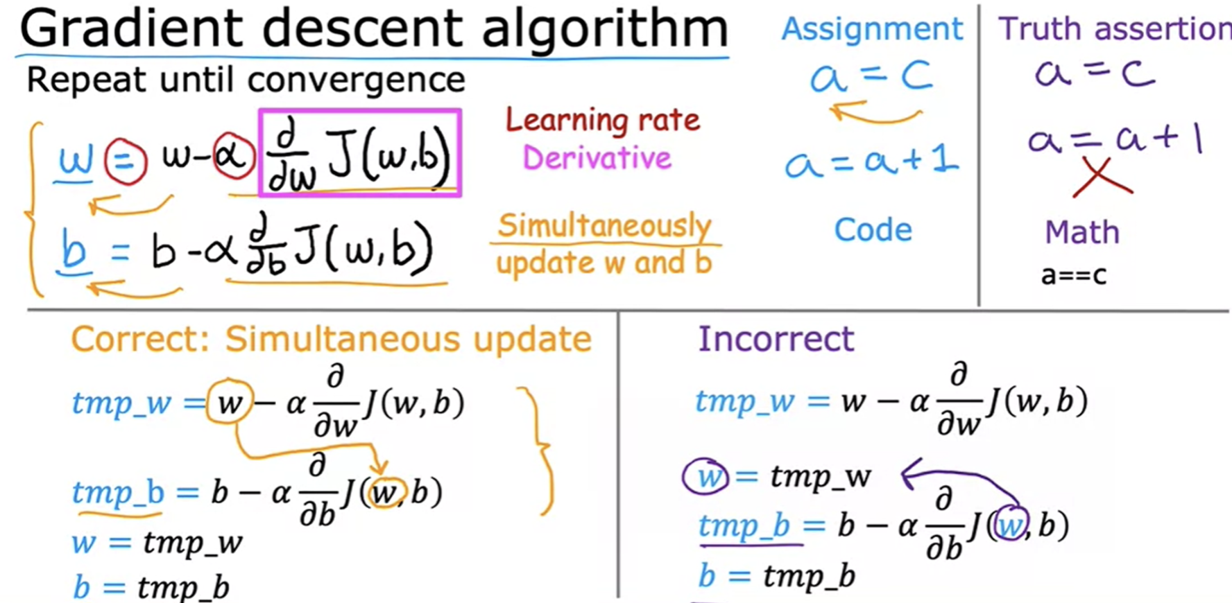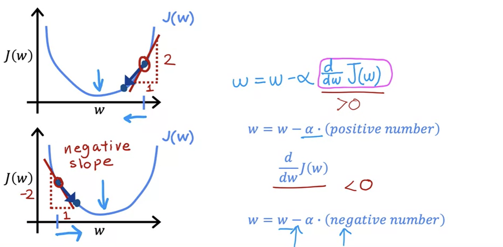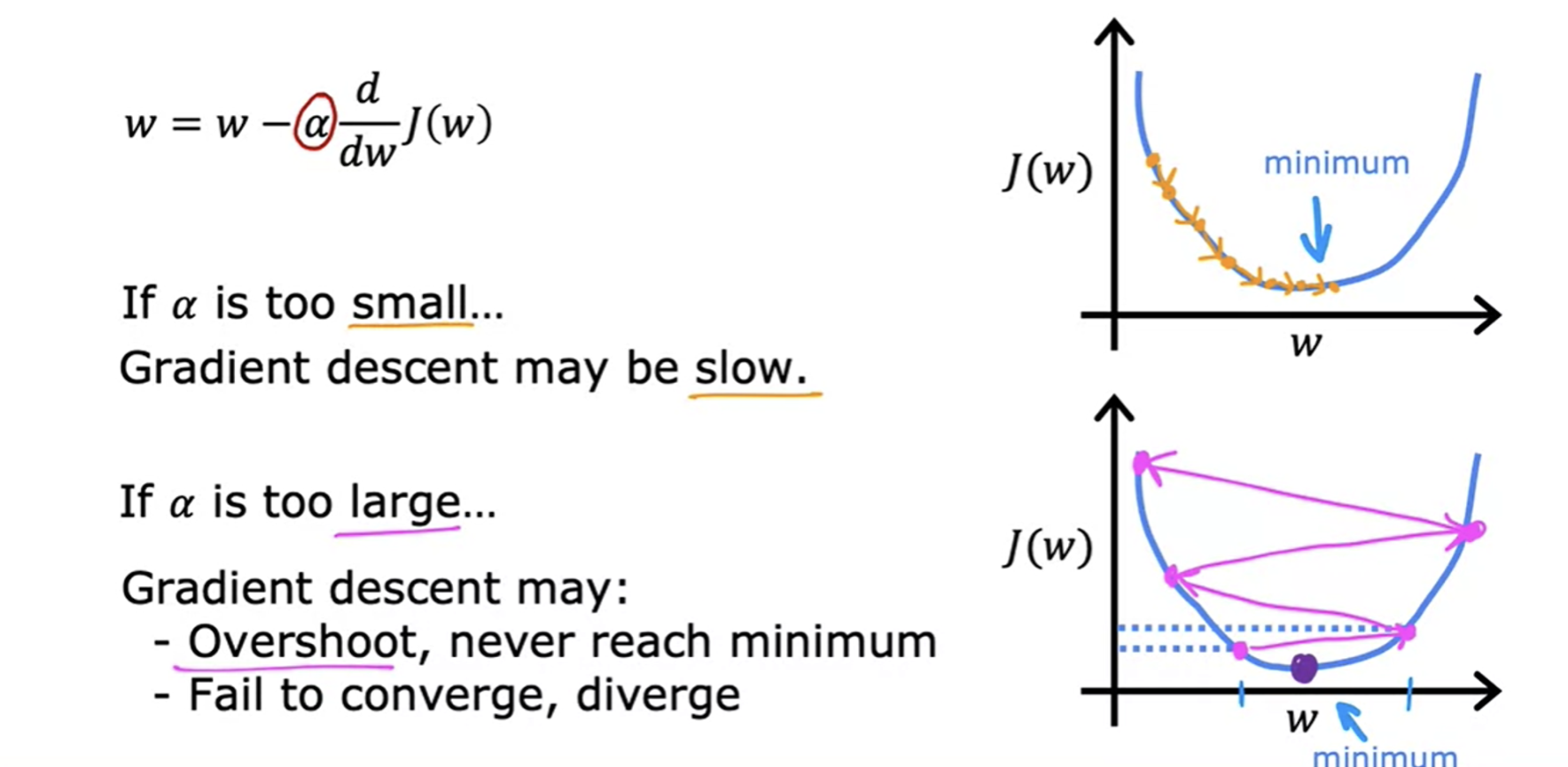 - learning rate이 크면 , derivate term이 커져서 저렇게 계속 더 벌어질 수 있음!! (Fails to converge, may even diverge)