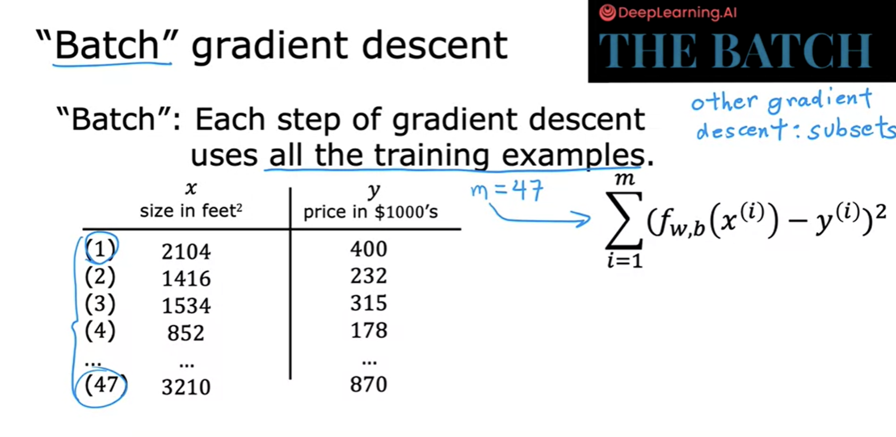 - 각 gradient descent step에서 총 cost를 계산하기 위해 모든 training data point를 사용하는 것을 “Batch” gradient descent라고 함!