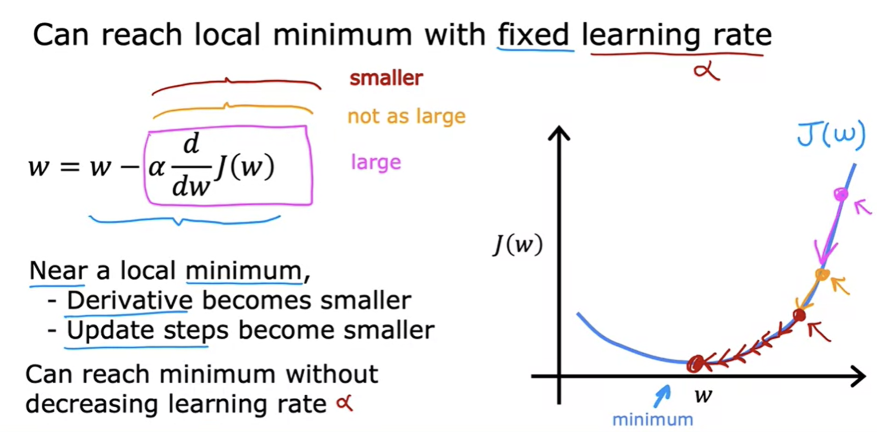 - local minimum에 다가갈수록 derivative term이 작아지면서 update 보폭도 점점 줄어듦!