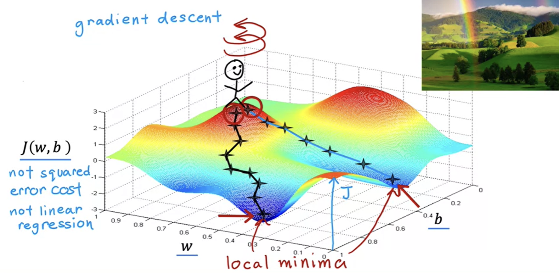 - repeat step 2 until you cannot go down anymore (you found yourself a local minima, but is it the global minimum?)