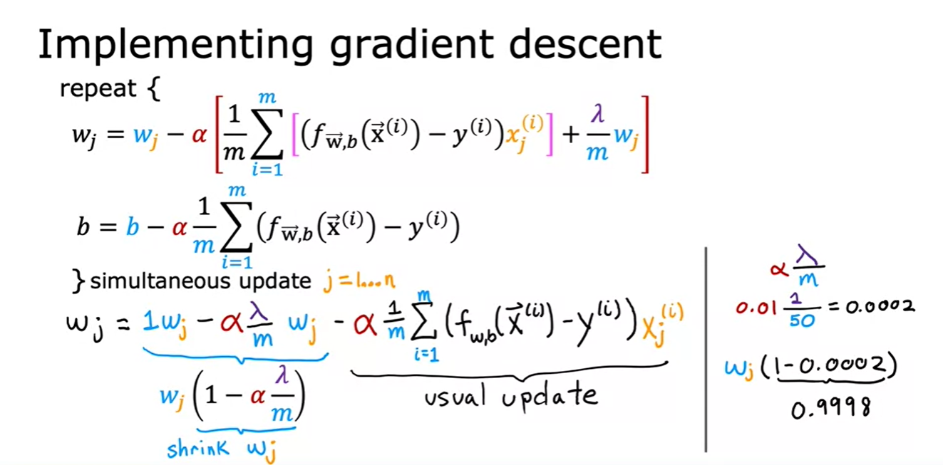 - 따라서 정규화는 매 반복마다 파라미터 w_j를 약간씩 감소시킨다.
