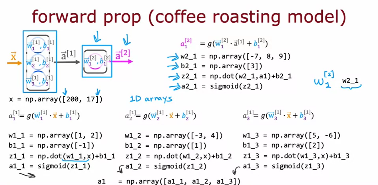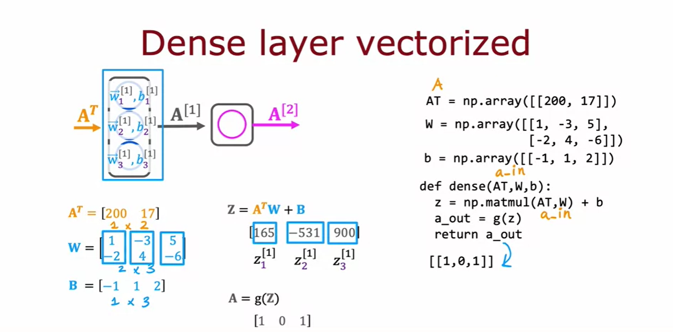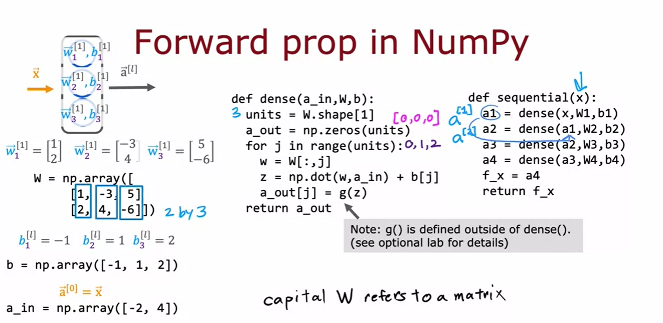 이번 영상에서는 Python으로 일반적인 순전파 구현을 설명한다. 핵심은 dense 함수를 작성해 신경망의 단일 층을 구현하는 것이다. dense 함수는 이전 층의 활성화 값과 현재 층의 파라미터(w와 b)를 입력으로 받아 현재 층의 활성화 값을 출력한다.