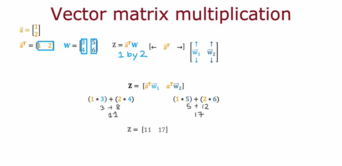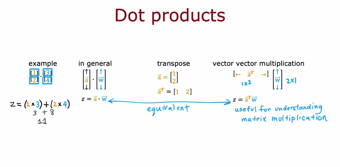 - 이는, 벡터 a의 전치(transpose)를 취해 행 벡터로 만들고, 이를 벡터 w와 곱하는 결과와 같다. (vector vector multiplication)