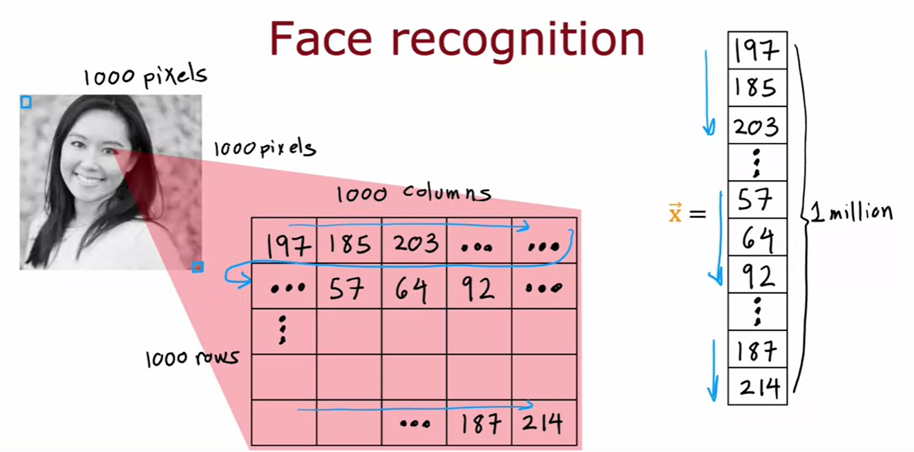 - 얼굴 인식 애플리케이션에서는 1,000x1,000 픽셀 이미지의 밝기 값(즉, 100만개의 픽셀값)을 벡터로 변환하여 신경망에 입력하고, 이를 통해 인물의 신원을 출력하도록 훈련한다.