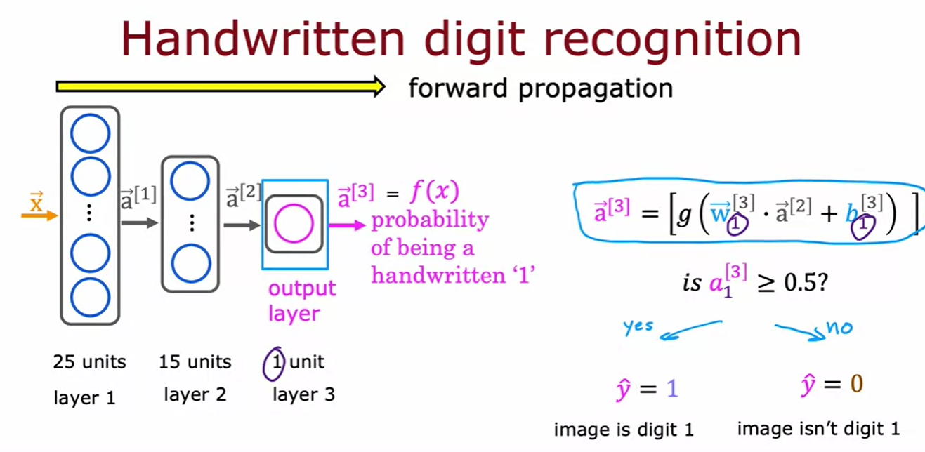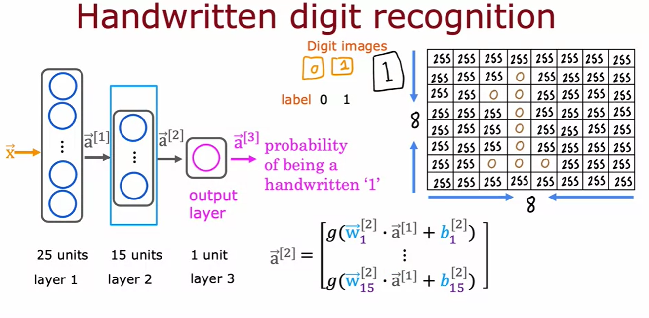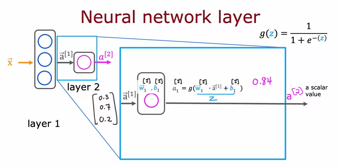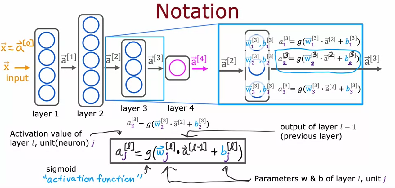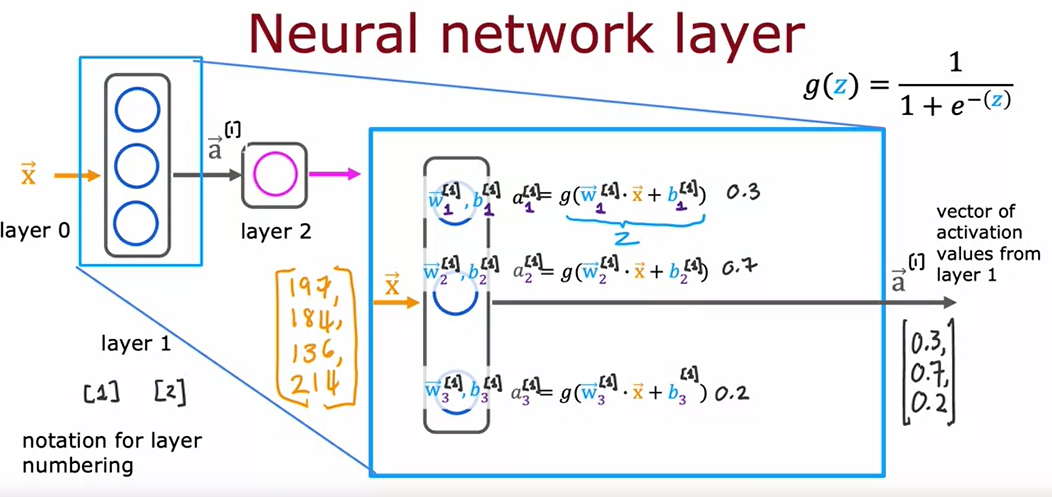 - 활성화 값 계산: 예를 들어, 첫 번째 뉴런은 a_1 = g(w_1 · x + b_1), 두 번째 뉴런은 a_2 = g(w_2 · x + b_2), 세 번째 뉴런은 a_3 = g(w_3 · x + b_3)으로 계산됨.