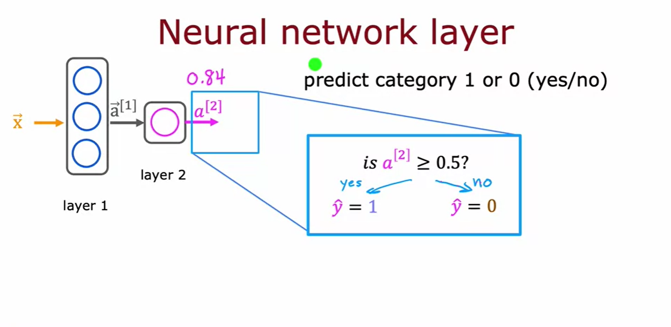 - 신경망이 a^[2]를 계산한 후, 0.5를 기준으로 이 값을 이진 예측(0 또는 1)으로 변환하여 최종 예측값 y^를 결정할 수 있음!