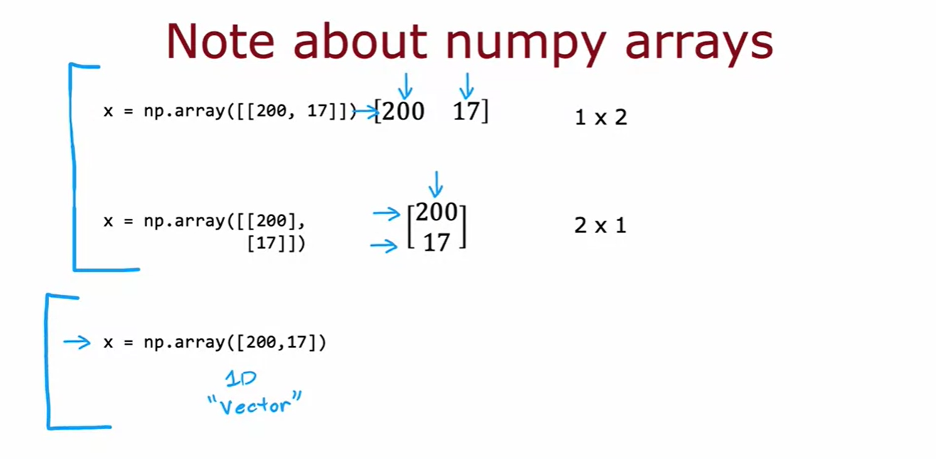 - [[200, 17]]은 1x2 행렬(행 벡터), [[200], [17]]은 2x1 행렬(열 벡터)을 생성합니다.
