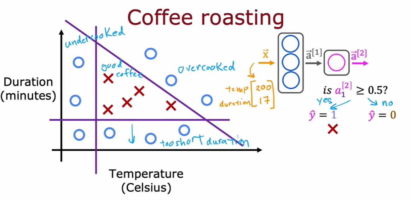 - 커피 로스팅 최적화를 위한 신경망 예제에서, 입력 특징 벡터 x(온도 200도, 시간 17분)를 통해 좋은 커피가 될지 예측한다.