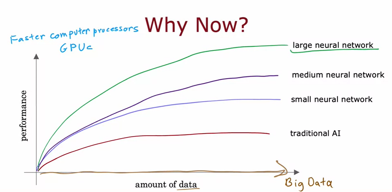 - 반면, 신경망(특히 대형 신경망)은 많은 데이터를 효과적으로 활용하여 성능을 지속적으로 향상시킬 수 있었으며, GPU와 같은 빠른 컴퓨터 프로세서의 발전도 딥러닝 알고리즘의 발전에 기여했다.