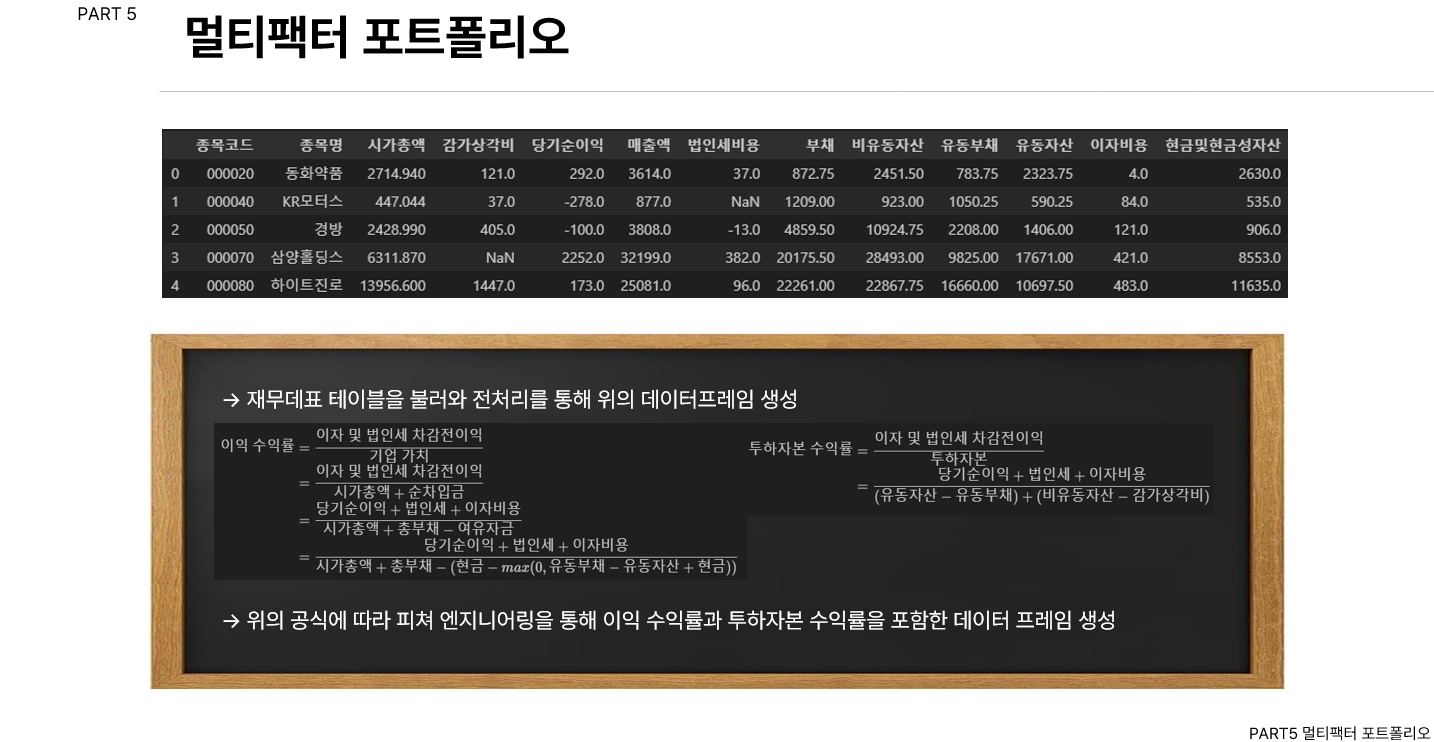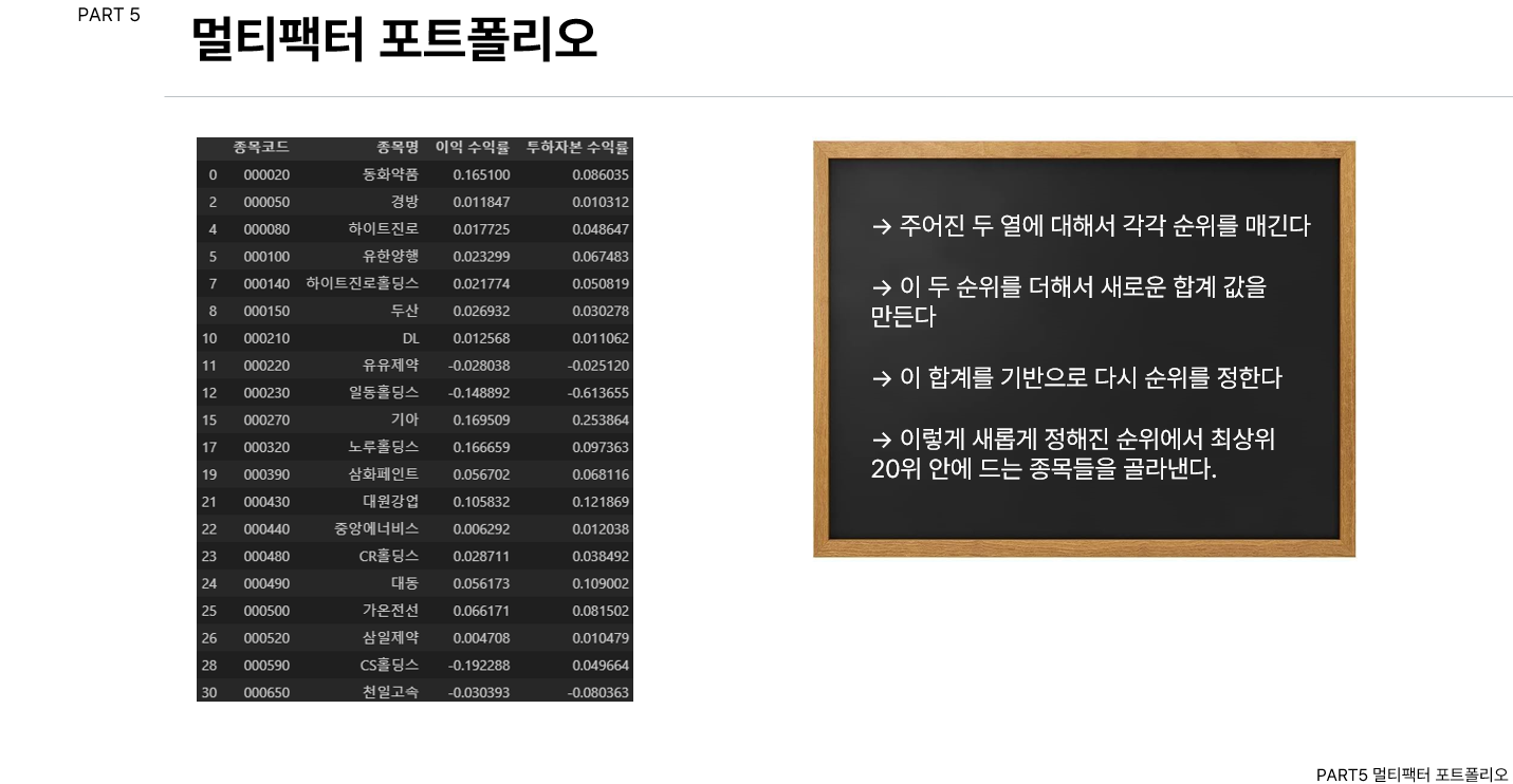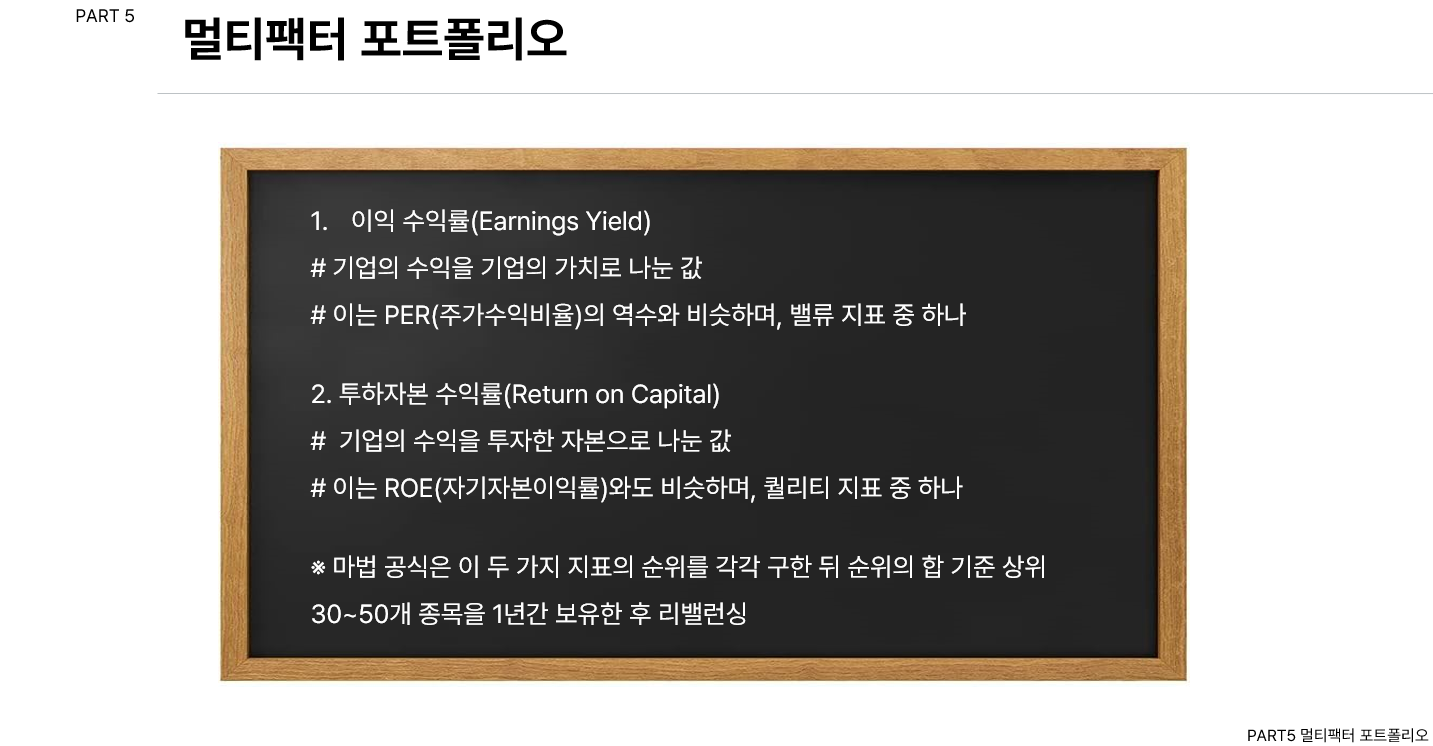 - Step 1: 멀티팩터 포트폴리오가 무엇인지 그리고 멀티팩터 포트폴리오로 유명한 조엘 그린블라트의 마법공식을 사용해서 국내주식으로 구성해보겠습니다.