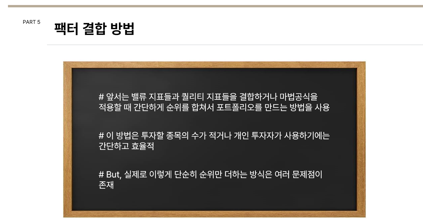 - 이 두 팩터를 적절히 조합함으로써, 합리적인 가격에 내재 가치가 높고 우수한 주식을 선별할 수 있습니다.