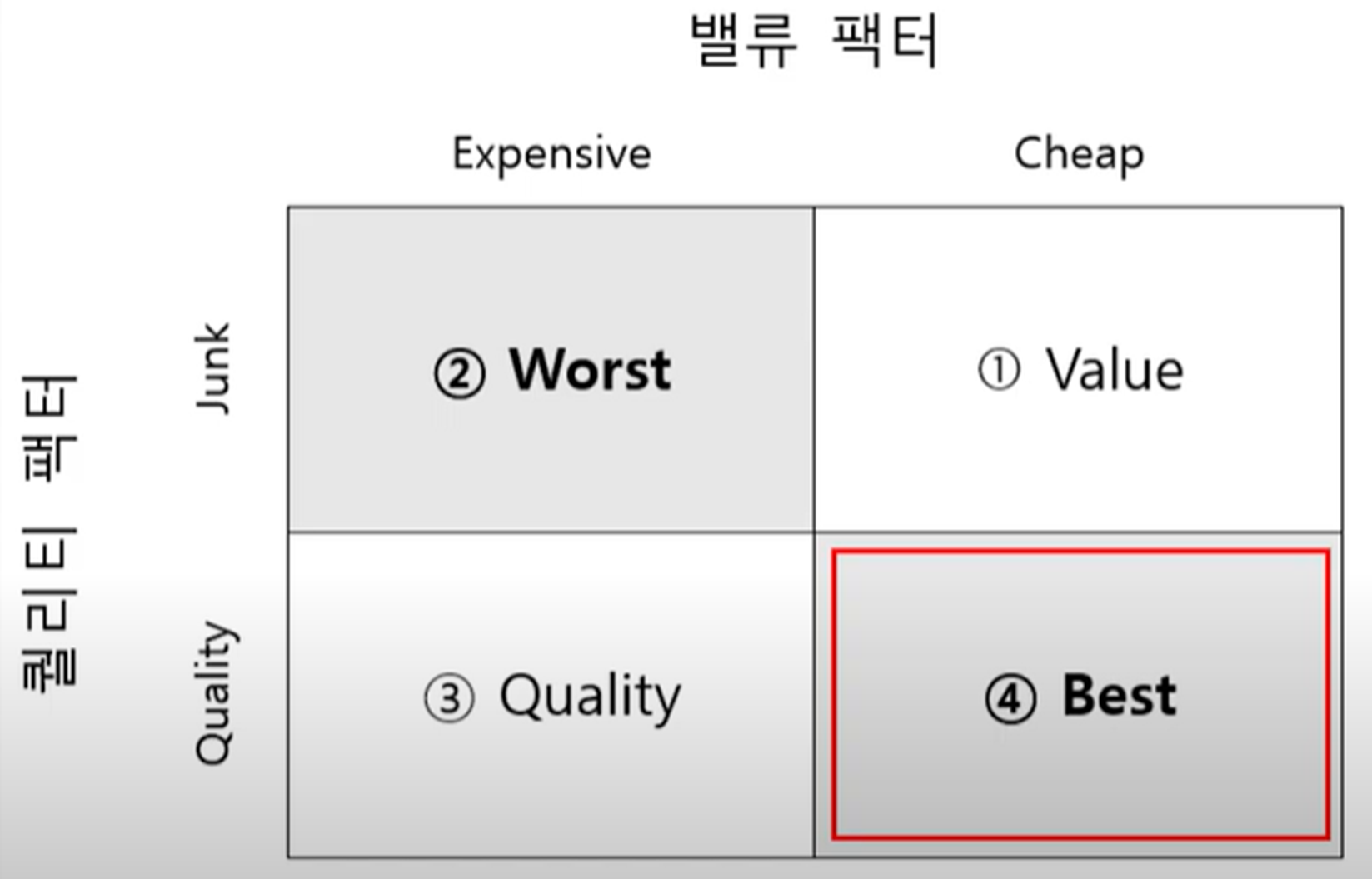 이 중 우리가 찾고자 하는 이상적인 투자 대상은 바로 4번, 저밸류-고우량성 주식입니다. 이는 높은 수익성와 합리적인 가격을 모두 갖춘 최적의 투자 기회를 나타냅니다.