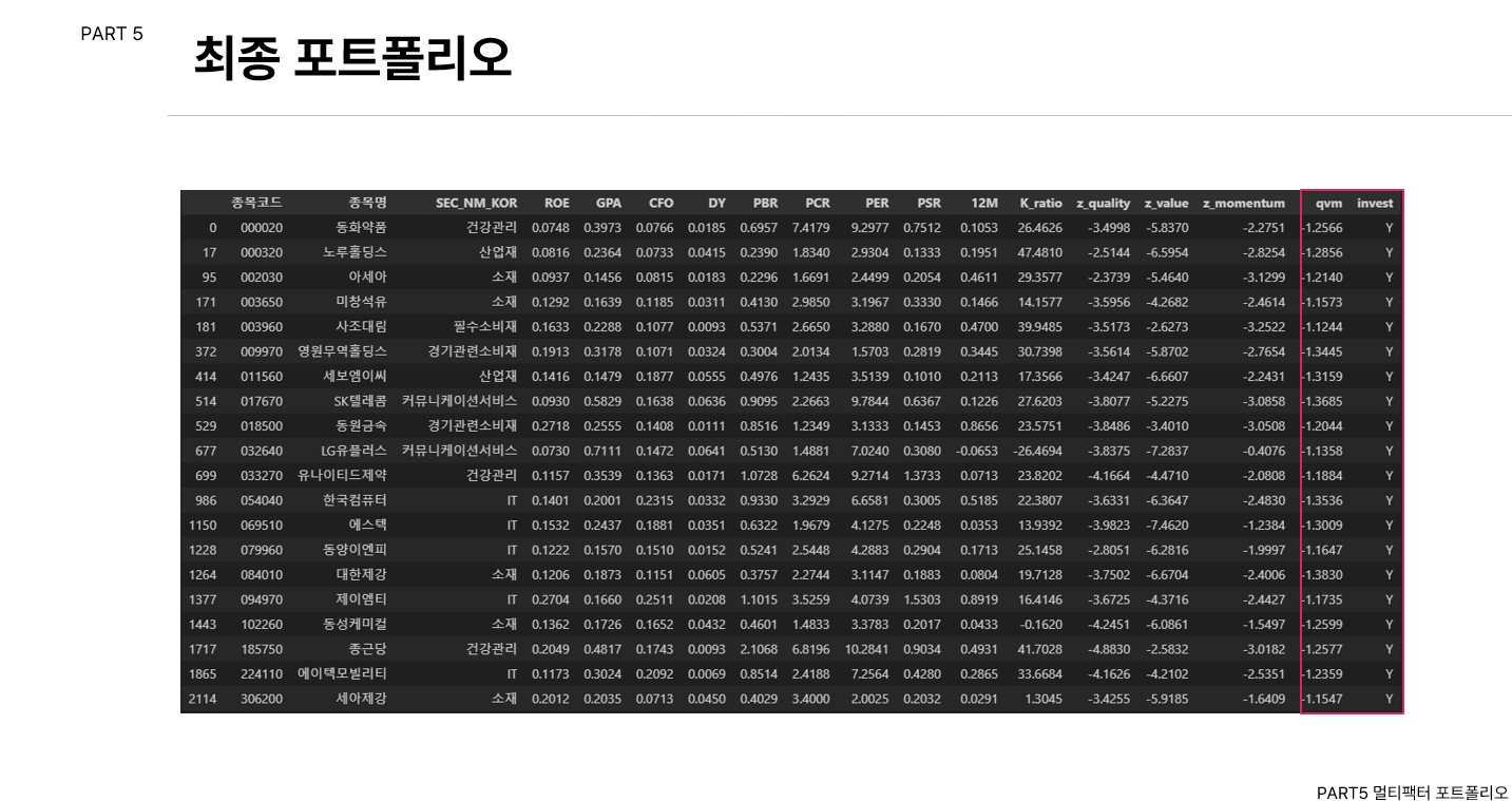 - 최종적으로, 'z_quality', 'z_value', 'z_momentum'에 각각 0.3의 비중을 주어 이 세 가지 팩터를 종합한 'qvm' 값을 생성합니다.