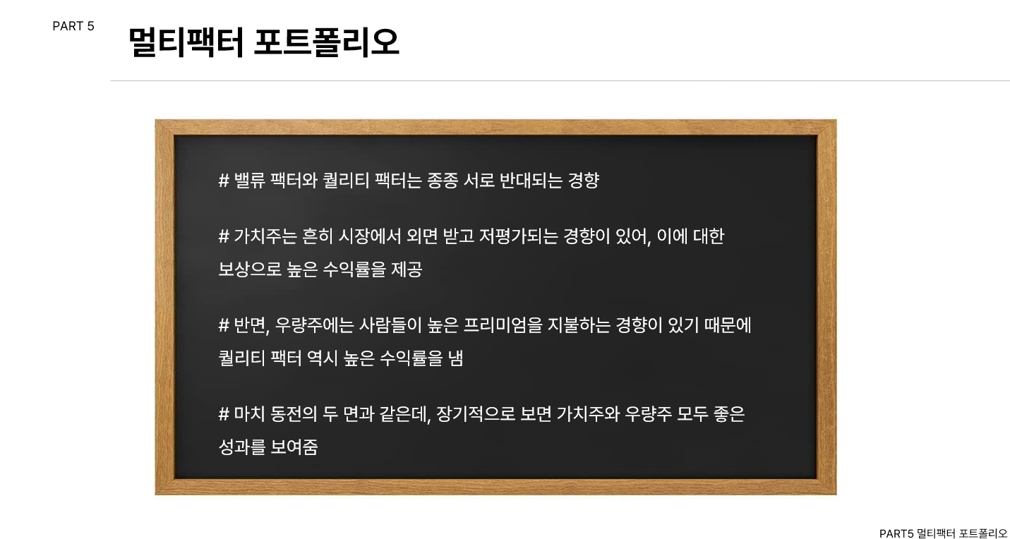 - 밸류 팩터와 퀄리티 팩터는 종종 상반되는 경향을 보이지만, 둘다 각각의 이유로 높은 수익률을 제공합니다.