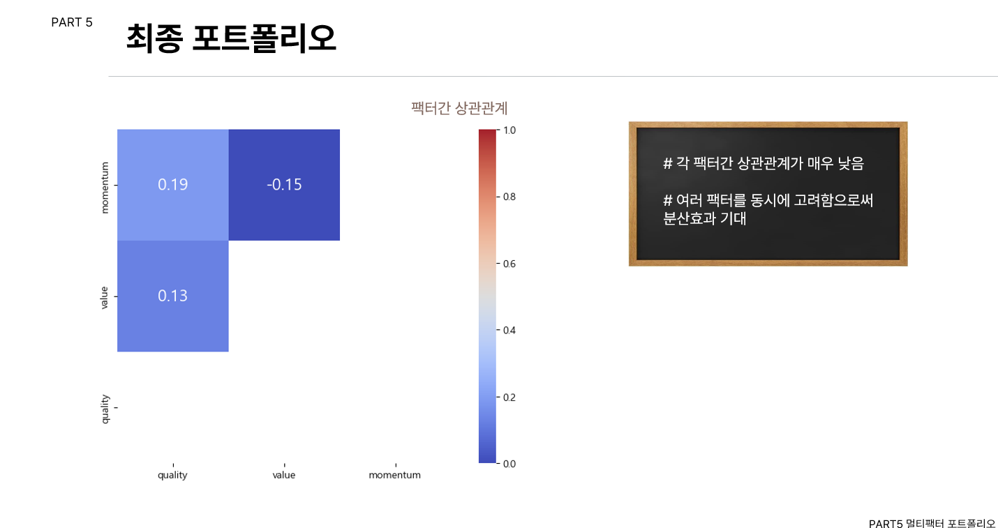 이는 여러 팩터를 함께 사용할 경우 분산 효과를 기대할 수 있음을 의미하죠!