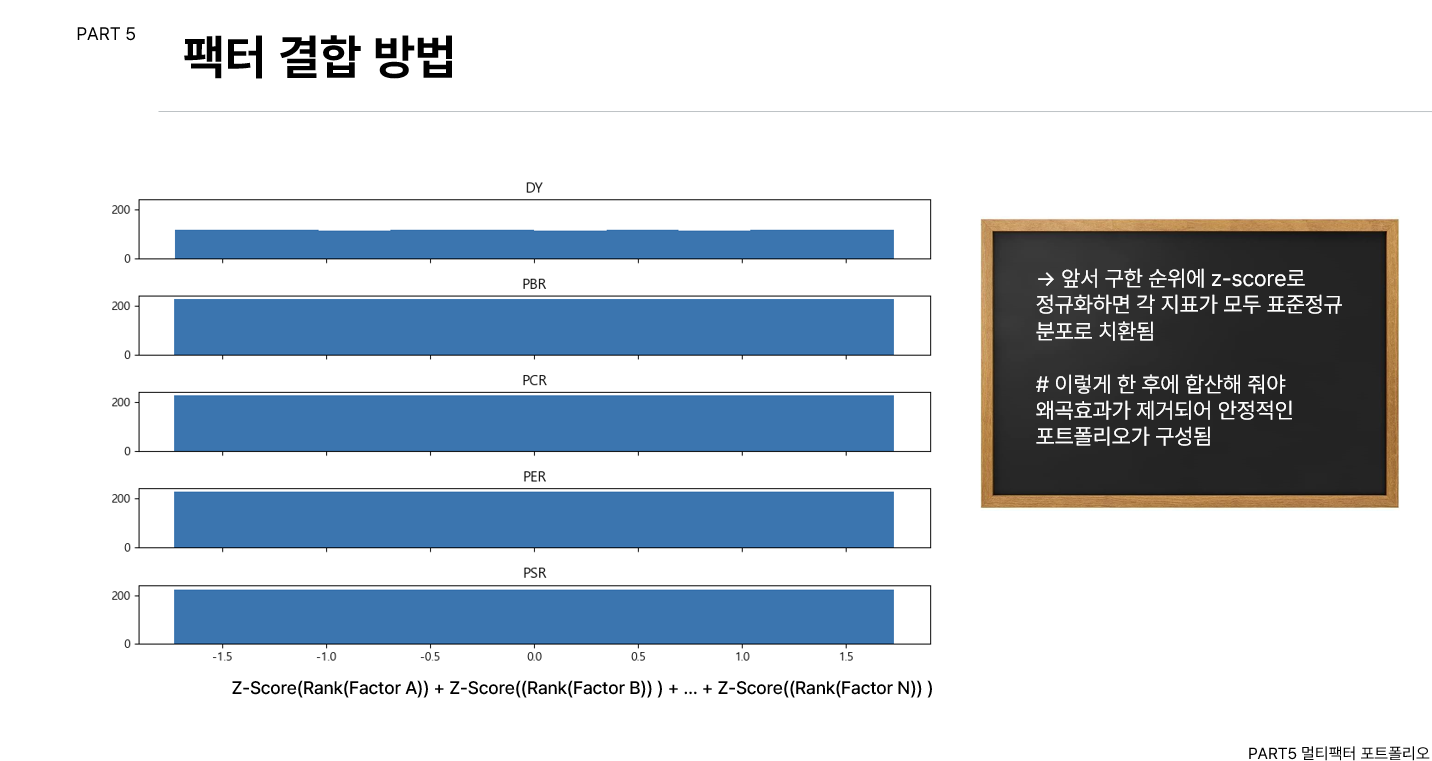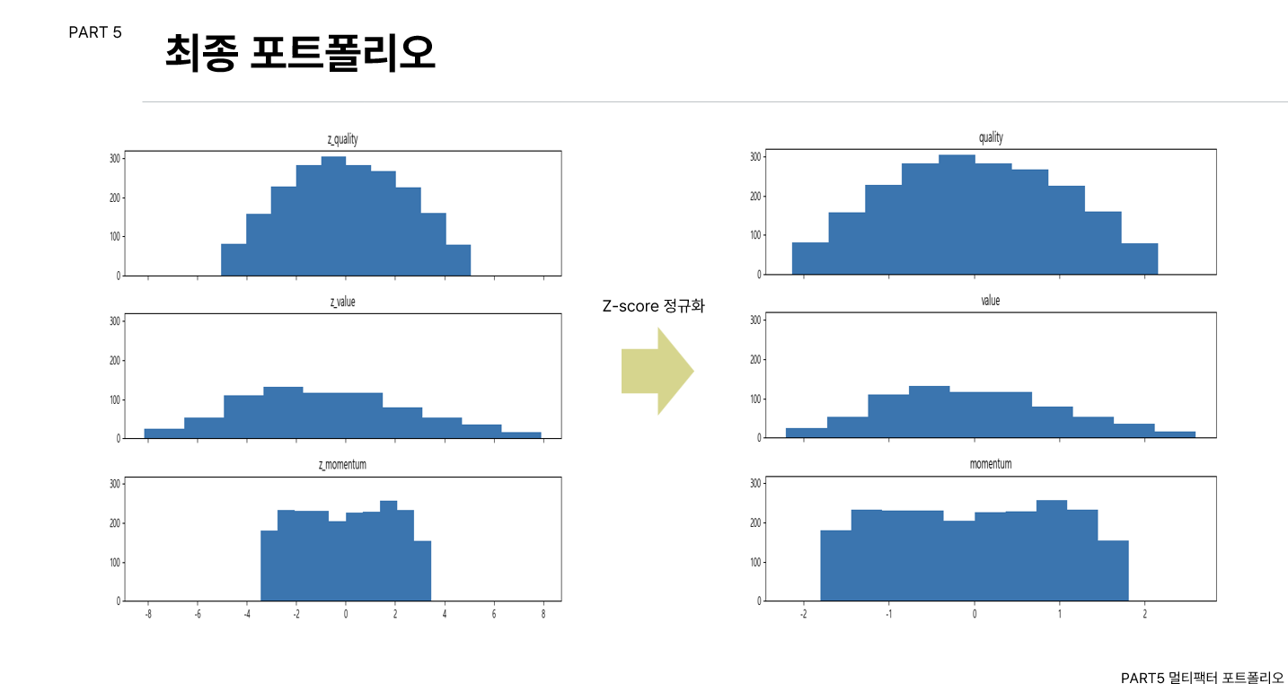 - 이 방식은 다양한 지표들의 분포를 표준화하여, 모든 팩터가 포트폴리오에 공정하게 기여할 수 있도록 합니다.
