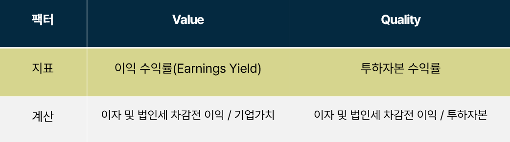 - 조엘 그린블라트의 마법 공식은 밸류 지표인 이익 수익률과 퀄리티 지표인 투하자본 수익률을 활용합니다.