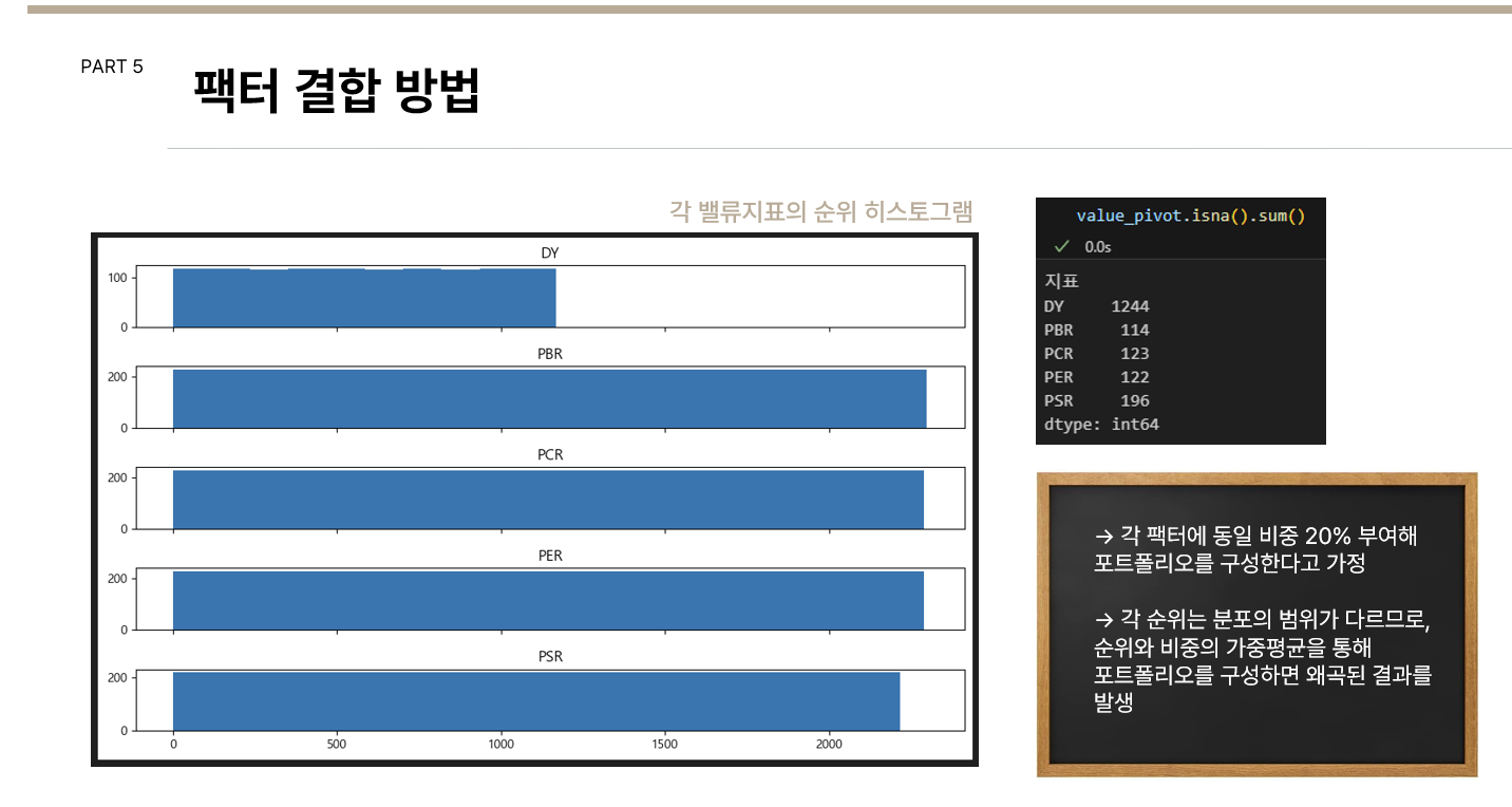 각 팩터(DY, PBR, PCR, PER, PSR)에 동일한 비중(20%)을 부여하여 포트폴리오를 구성한다고 가정하면, 순위의 범위가 다르기 때문에 결과에 왜곡이 발생할 수 있습니다.