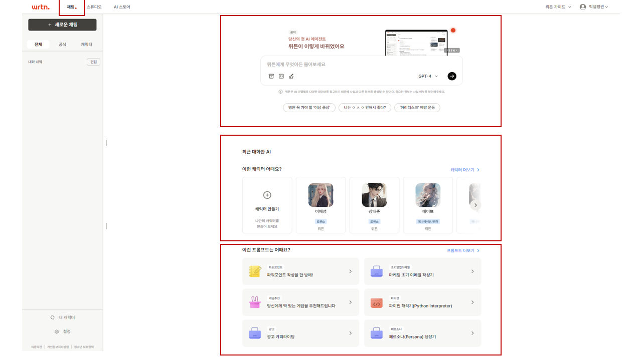 뤼튼은 채팅, 스튜디오, AI 스토어라는 세 가지 주요 탭으로 구성되어 있습니다.