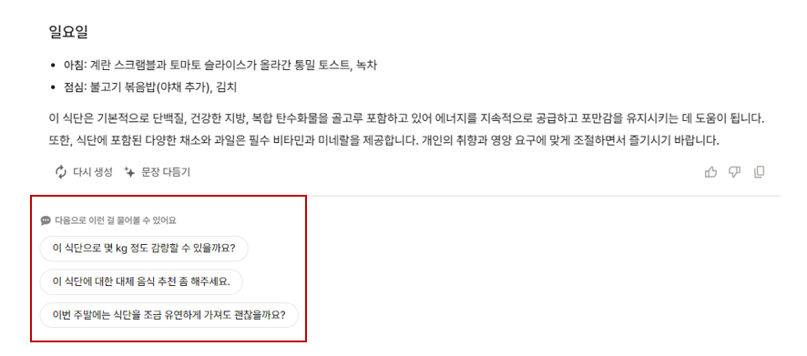 둘째로, 뤼튼이 사용자에게 추가로 질문할 수 있는 리스트를 제공하는 기능이 매우 유용하다고 느꼈어요.